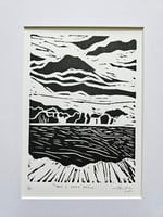 Linocut print of archival St Cuthberts Mill 300gsm paper.